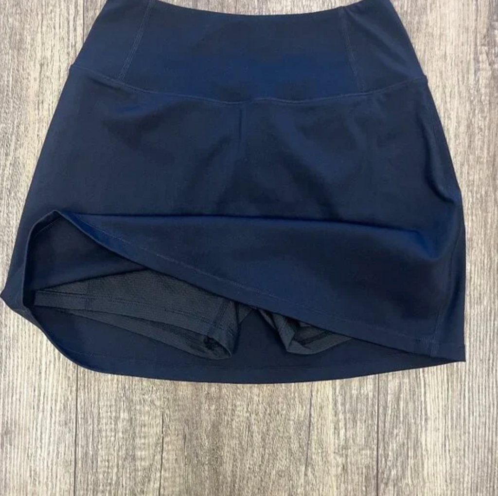 This is a nylon and spandex blend, buttery soft and stretchy. This skirt is very flattering with a high waisted band on top and has shorts attached to the skirt. Perfect for running, working out, tennis, golf or just to wear everyday.
