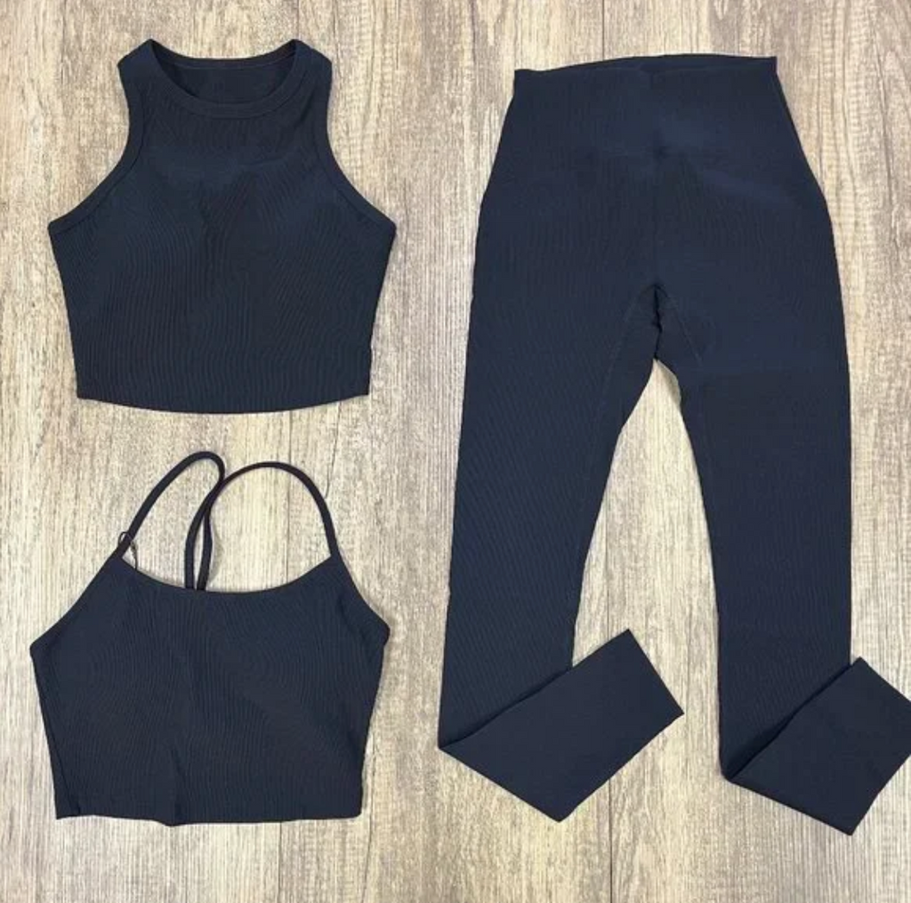 This bundle is in a soft, stretchy, ribbed material, both tops have built in bras and removable padding. The leggings are high waisted with a curved classic seam. The tops and bottoms are both in a size small