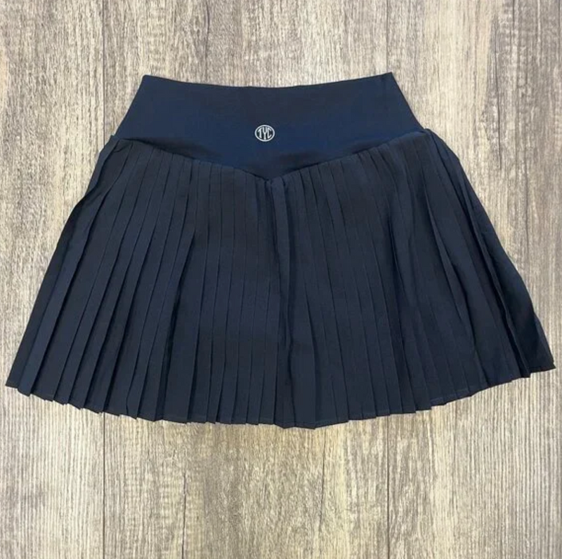 This is a cute pleated skirt with shorts underneath. This is a cute look for tennis or golfing. The shorts are made up of a nylon and spandex blend and the outside skirt is a polyester and spandex blend.