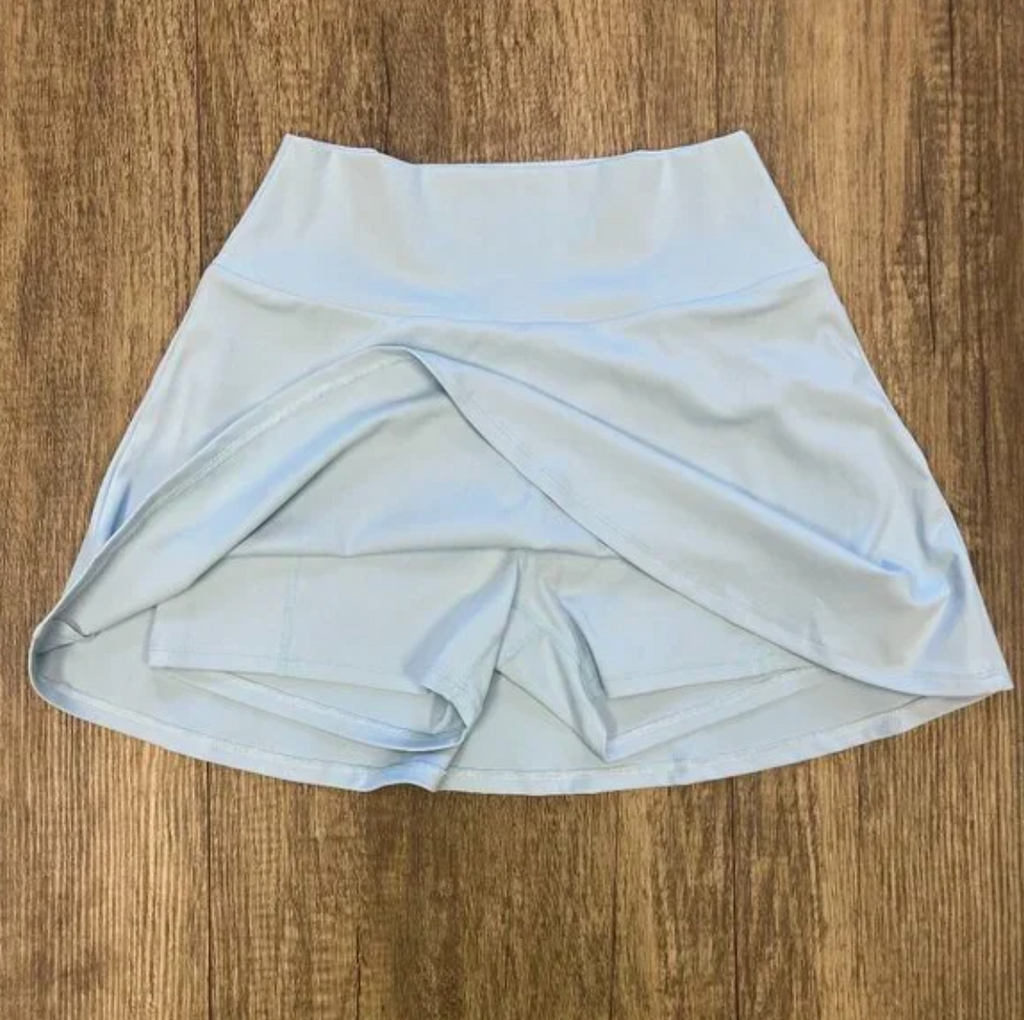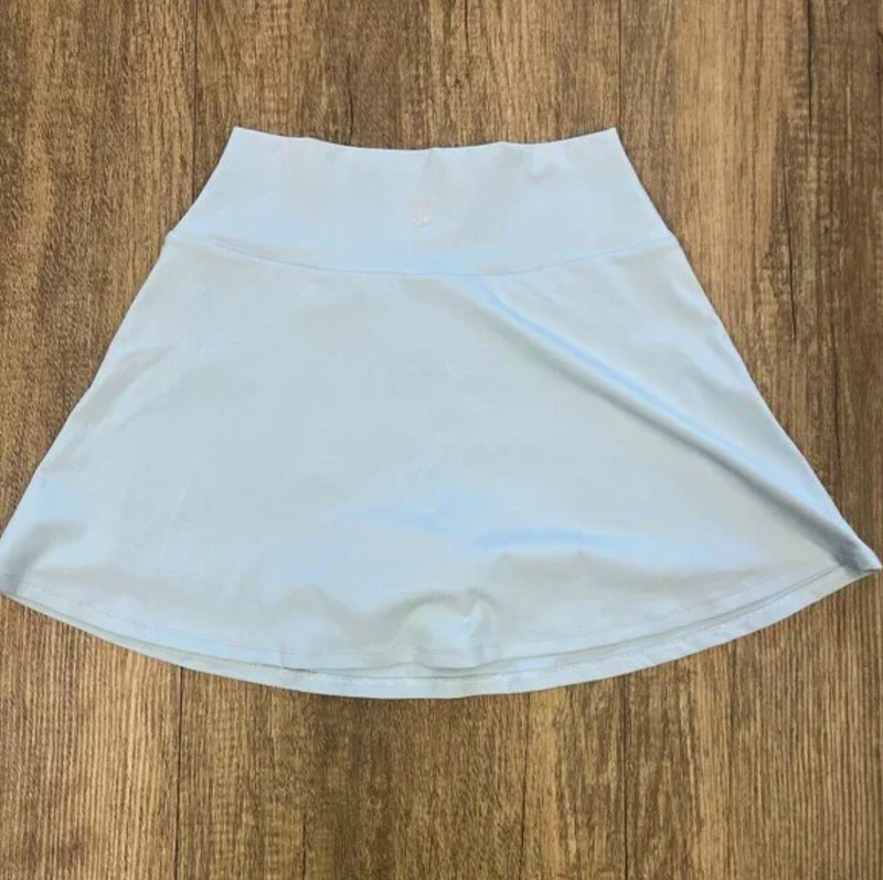 This is a polyester and spandex blend, super buttery soft and stretchy. This skirt is very flattering with a high waisted band on top, a cute flare detailing on the sides of the skirt and has shorts attached to the skirt. Perfect for running, working out, tennis, golf or just to wear everyday.